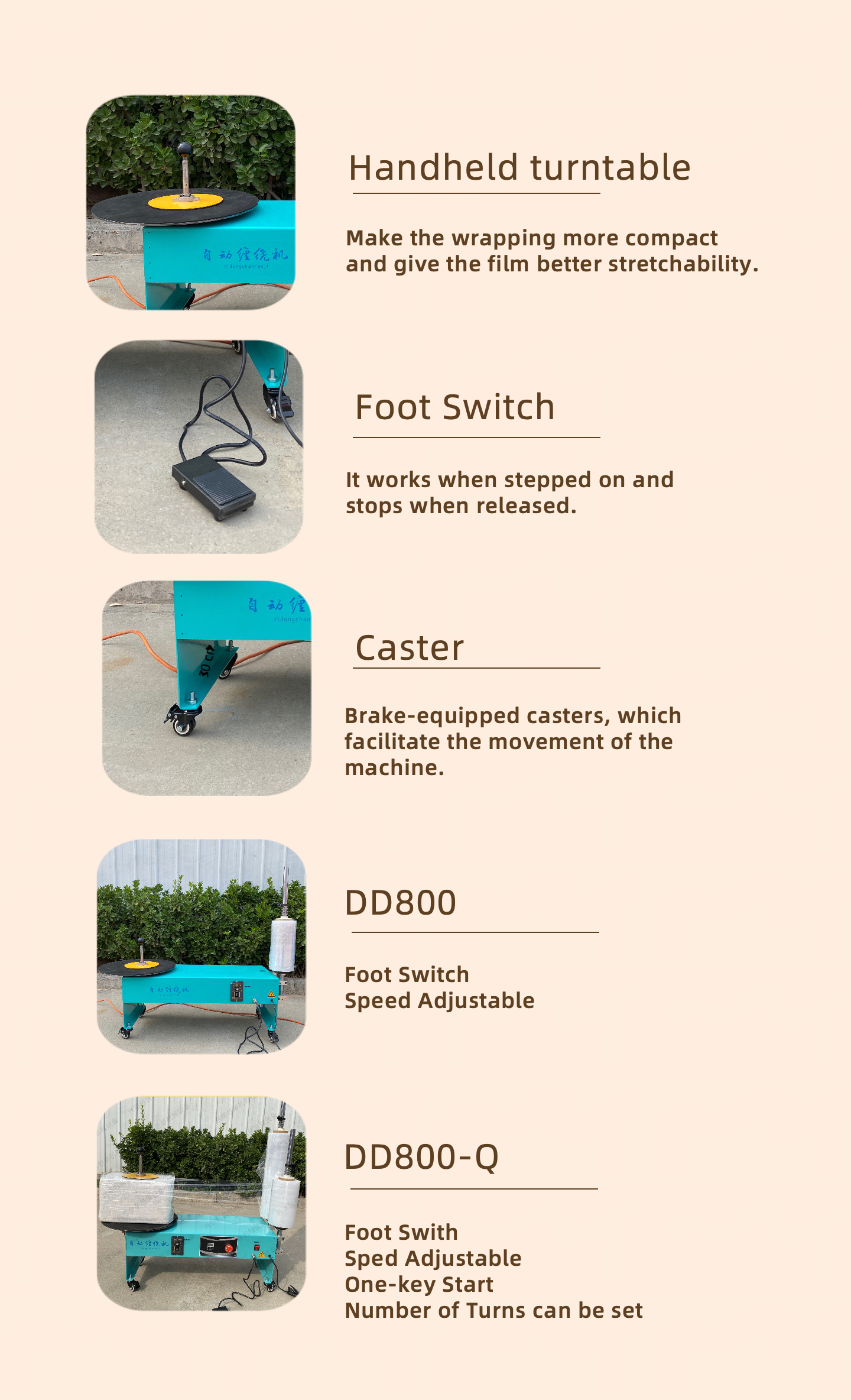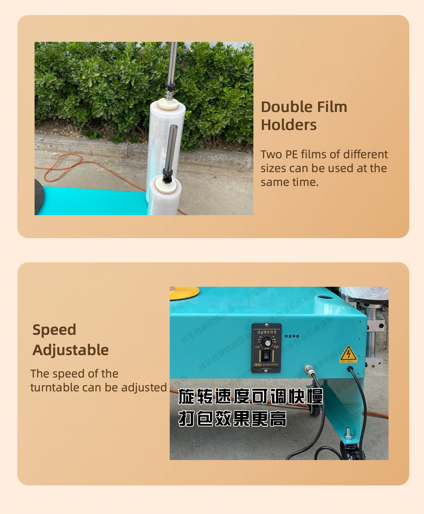 Automatic Wrapping MachineThe small desktop stretch wrapping machine is an efficient packaging device specifically designed for small goods, parts, or light - weight items. It is widely used in small - batch packaging scenarios in industries such as electronic components, hardware accessories, small medical devices, stationery, and aquatic products. Its compact body design saves valuable desktop space while achieving the same core packaging functions as large - scale stretch wrapping machines. It fixes items by stretching stretch film or adhesive tape to form a sealed and stable packaging effect, effectively preventing damage to goods caused by collisions and friction during transportation and storage. At the same time, it also has protective functions against dust and moisture.小型桌面缠绕包装机是一款专为小型货物、零部件或轻型物品设计的缠绕膜和胶带包装设备,广泛应用于电子元件、五金配件、小型医疗器械、文具用品、水产冷鲜等行业的小批量包装场景。其紧凑的机身设计节省了宝贵的桌面空间,却能实现与大型缠绕机同等核心的包装功能 —— 通过拉伸缠绕膜和胶带对物品进行缠绕固定,形成密封且稳固的包装效果,有效防止货物在运输、存储过程中因碰撞、摩擦导致的损坏,同时具备防尘、防潮的保护作用。In terms of structure and working principle, the desktop stretch wrapping machine usually consists of a rotating worktable, a film holder, a lifting system (manual adjustment in some models), and a control system. During operation, place the items to be packaged on the rotating worktable, manually pull out the stretch film or adhesive tape and fix it at the bottom of the item. After starting the equipment, the rotating worktable drives the item to rotate at a constant speed, and the film holder releases the stretch film synchronously according to preset parameters such as the number of wrapping circles and the stretching force of the film. As the item rotates, the stretch film will closely adhere to the surface of the item, spirally wrapping from the bottom up until the entire height of the item is covered. After the packaging is completed, the equipment stops automatically, and the stretch film can be cut off. Some high - end models also support adjusting the wrapping speed and setting the number of reinforced wrapping circles at the top/bottom to meet the packaging needs of different items.从结构与工作原理来看,桌面缠绕包装机通常由旋转工作台、膜架、升降系统(部分机型为手动调节)及控制系统组成。操作时,将待包装物品放置在旋转工作台上,手动引出缠绕膜或胶带并固定在物品底部,启动设备后,旋转工作台带动物品匀速转动,膜架则根据预设参数(如缠绕圈数、膜的拉伸力度)同步释放缠绕膜。随着物品的旋转,缠绕膜会紧密贴合在物品表面,从底部向上螺旋缠绕,直至覆盖整个物品高度,完成包装后设备自动停止,切断缠绕膜即可。部分高端机型还支持调节缠绕速度、设定顶部 / 底部加强缠绕圈数,以满足不同物品的包装需求。 Regarding performance advantages, the desktop stretch wrapping machine is characterized by "compactness and high efficiency". Its floor area is usually only 0.5 - 1 square meter, suitable for environments with limited space such as laboratories, small workshops, and warehouse corners. The packaging efficiency can reach 10 - 30 pieces per hour, saving more than 50% of the time compared to manual wrapping and significantly reducing labor costs. By mechanically stretching the stretch film, the utilization rate of the film can be increased by 20% - 30%, reducing waste of packaging materials. In addition, the equipment is driven by a low - noise motor, and the running noise is generally less than 60 decibels, meeting the noise standards of office and production environments.在性能优势方面,桌面缠绕包装机以 “小巧效率高” 为核心特点。其占地面积通常仅为 0.5-1 平方米,适合实验室、小型车间、仓库角落等空间有限的环境;包装效率可达每小时 10-30 件,相比人工缠绕能节省 50% 以上的时间,大幅降低人工成本;通过机械拉伸缠绕膜,能使膜的利用率提升 20%-30%,减少包装材料浪费;此外,设备采用低噪音电机驱动,运行时噪音一般低于 60 分贝,符合办公及生产环境的噪音标准。 The weight of the items suitable for this equipment is usually between 5 - 50 kilograms, and the maximum packaging height is approximately 30 - 100 centimeters depending on the model. It can adapt to various forms of items such as cartons, plastic boxes, and small parts with irregular shapes. Whether it is the independent packaging of a single small product or the combined packaging of multiple small items, a neat and firm winding effect can be achieved through it.该设备适用的包装物重量通常在 5-50 公斤之间,有效包装高度根据机型不同约为 30-100 厘米,能适配纸箱、塑料盒、不规则形状的小部件等多种形态的物品。无论是单个小型产品的独立包装,还是多个小件物品组合后的集合包装,都能通过它实现整齐、牢固的缠绕效果。 In terms of operation and maintenance, the desktop stretch wrapping machine adheres to the design concept of "simplicity and ease of use". The control panel mostly adopts button or touch - screen operation, equipped with clear icon instructions. Even operators using it for the first time can master the basic process within a few minutes. The vulnerable parts of the equipment (such as bearings and motors) are designed in a standardized way. Daily maintenance only requires regular cleaning of the worktable surface, inspection of the film holder tension, and addition of lubricant. The maintenance cost is low, the failure rate is low, and it can maintain a stable worki